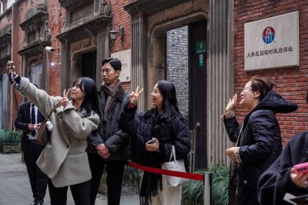 自中國對韓國持普通護照人員試行免簽政策以來,到中國旅遊的韓國人越來越多。圖為韓國遊客在上海大韓民國臨時政府舊址打卡拍照。