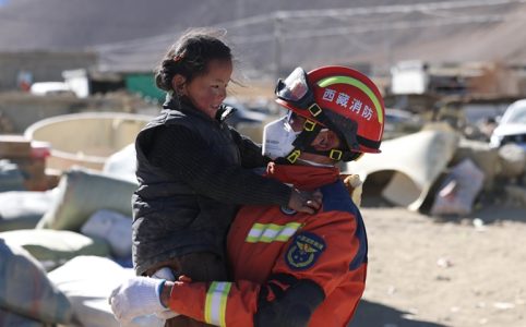1月10日,日喀則定日縣措果鄉塘仁村,一位西藏消防救援隊的戰士在和村里的小女孩玩耍。 人民網