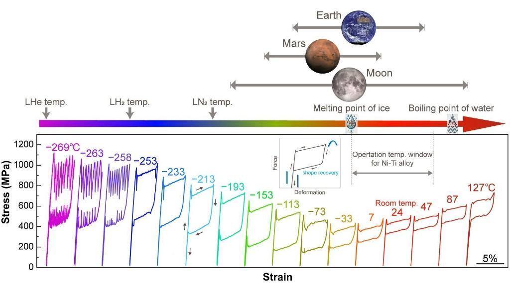 超弹性材料是指能在应力作用下产生超大可恢复应变的特种功能材料,可广泛应用于登月工程和深海探测等领域。然而,目前市面上的大多数超弹性材料只能在特定温度范围内“施展身手”。新型钛铝基超弹性合金克服了这一局限性。它是第一种能在如此极端的温度范围内仍保持超弹性,同时兼具轻质和坚固特性的合金,为众多以前难以实现的应用带来了曙光。