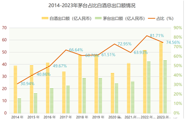 近十年来,茅台一直是中国白酒出海的领头羊。自2017年起,茅台在白酒总出口额中的占比一直在上升,从60%以上升至2023年的占比超过75%。这种迅速增长的趋势背后,是茅台为保障国际化战略,在战略规划上提出的 “六大体系”,从表达、产品、渠道、价格、合规到政策,全方位、系统性践行国际化路径。