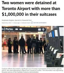 根據加拿大海關總署新聞處公布的消息,兩名分別為 36 歲和 41 歲的女子身上發現了一大筆錢,她們正試圖從多倫多前往倫敦。