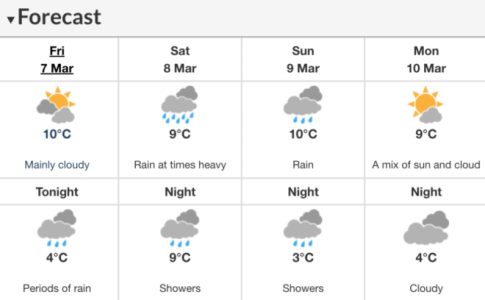 加拿大環境部的氣象學家Colin Fong表示,隨着風暴從3月7日周五夜間開始進入大溫地區,當地居民應準備好迎接連續多日的潮濕天氣。周五開始,基本每天都有雨。未來七天的天氣預報中,受3月6日的寒流影響,大溫未來幾日預計白天氣溫最高約為10攝氏度,夜間最低氣溫約為3攝氏度,低於平均水平。但大氣河流的到來,將使周末的夜間最低氣溫比季節平均水平高出幾度。