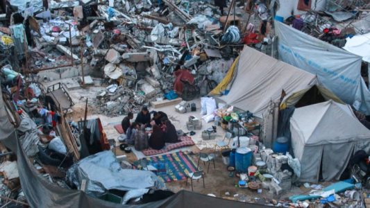 圖:3月4日,巴勒斯坦人在加沙地帶拜特拉希亞的一處帳篷旁用餐。圖源 新華社