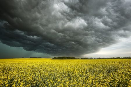 當地時間2022年7月29日,加拿大阿爾伯塔,克雷莫納附近的油菜籽田上空烏雲密布。 視覺中國