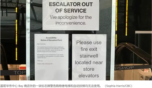 當購物者進入商店時,他們會看到警告標誌,提示商店的電梯和自動扶梯均無法使用,因此必須使用消防出口樓梯。