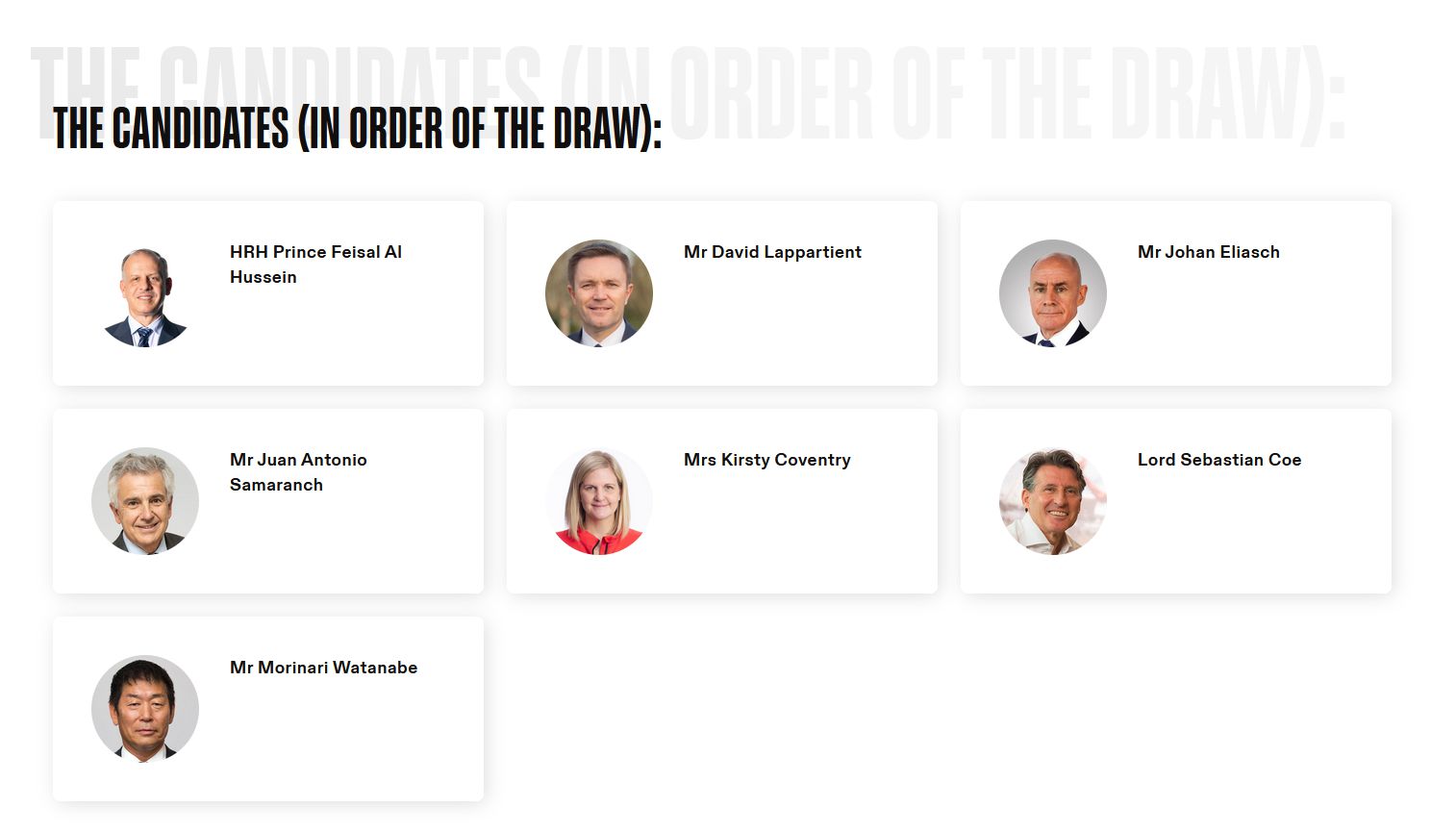 共七位候选人参与本次国际奥委会主席选举,包括国际奥委会执委费萨尔·侯赛因、国际自行车联盟主席大卫·拉帕尔蒂安、国际滑雪联合会主席约翰·埃利亚施、国际奥委会副主席小萨马兰奇、国际奥委会执委柯丝蒂·考文垂、世界田联主席塞巴斯蒂安·科以及国际体操联合会主席渡边守成。