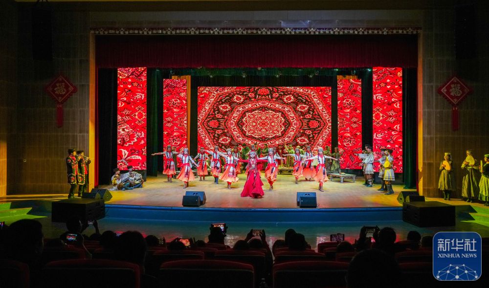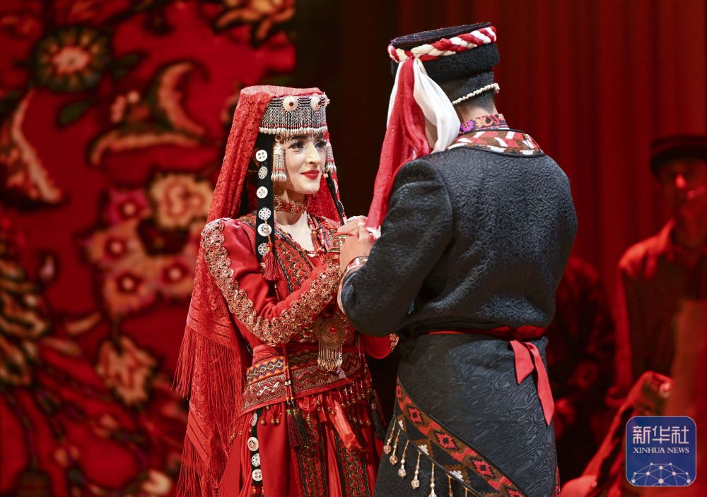 ↑ 3月22日,在新疆塔什库尔干塔吉克自治县葱岭演艺中心,音乐剧演员表演非物质文化遗产塔吉克族婚俗舞蹈。