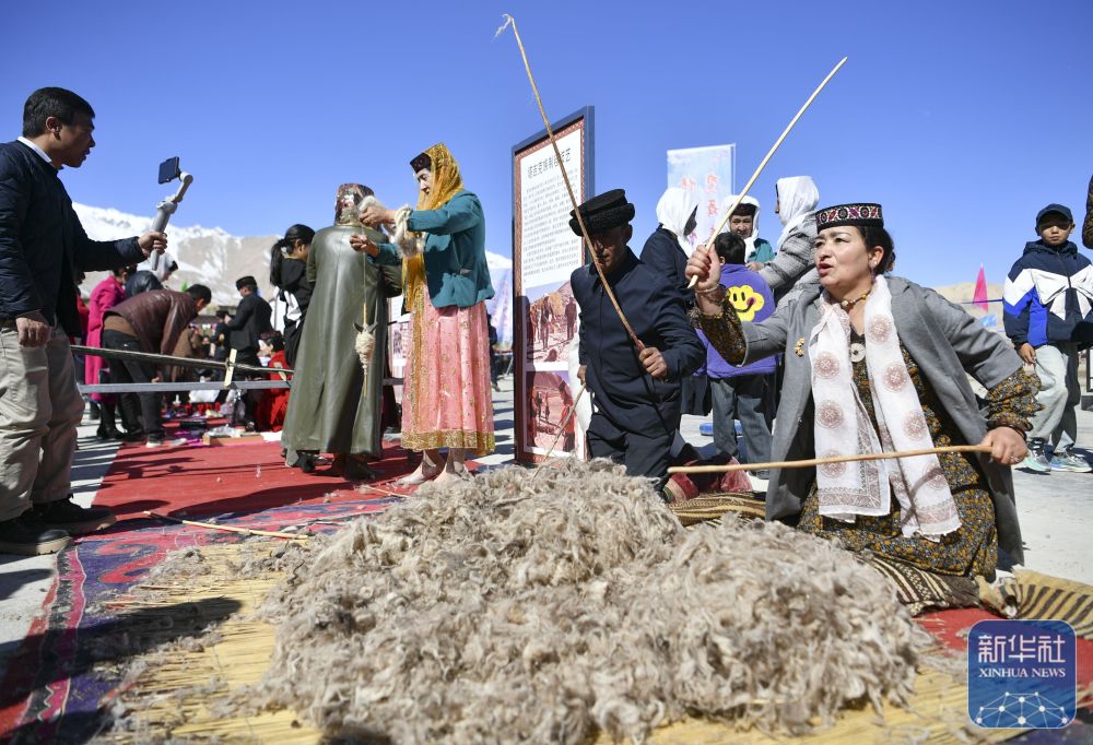 ↑ 非遗传承人在新疆塔什库尔干塔吉克自治县提孜那甫乡赛马场展示塔吉克族毛纺制作技艺(3月23日摄)。