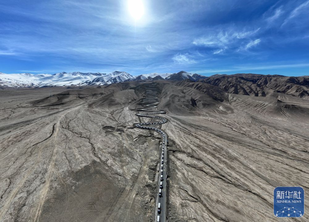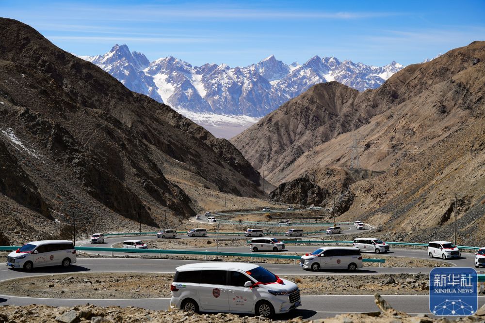 ↑ 3月22日,在新疆塔什库尔干塔吉克自治县,参加“盘龙古道”恢复通车仪式的车队在行进中。“盘龙古道”在冬季封锁,春季恢复通车,当地丰富的文化活动吸引大量游客前来,使得“盘龙古道”近年来成为热门的旅游线路。