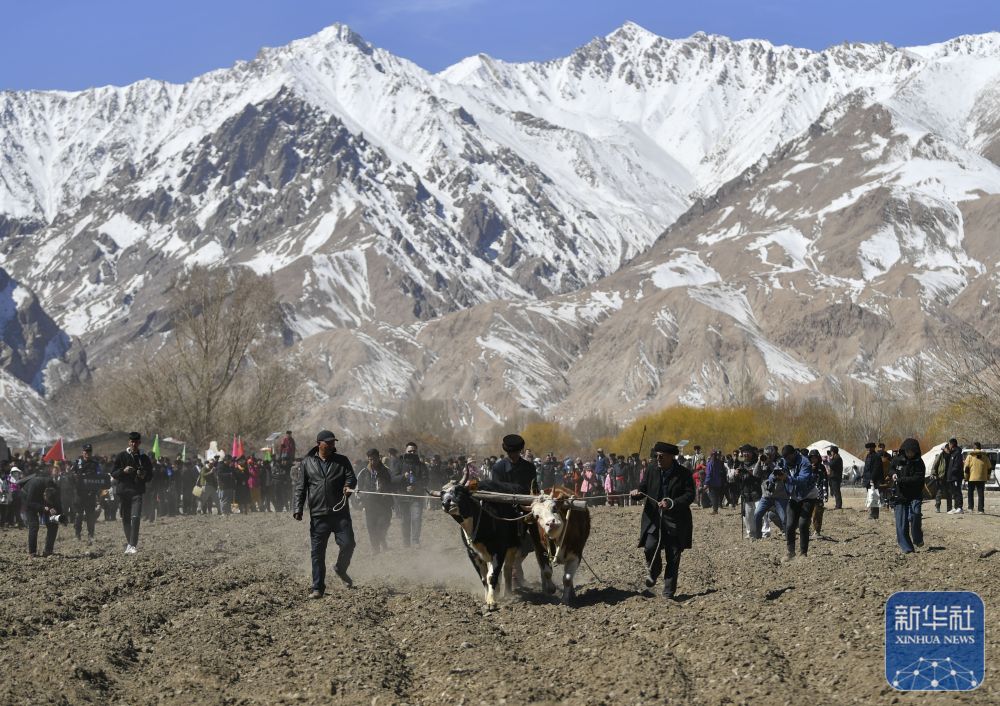 ↑ 在新疆塔什库尔干塔吉克自治县“彩云人家”民俗村,村民为游客表演传统农业生产中的犁地方式――“二牛抬杠”(3月22日摄)。