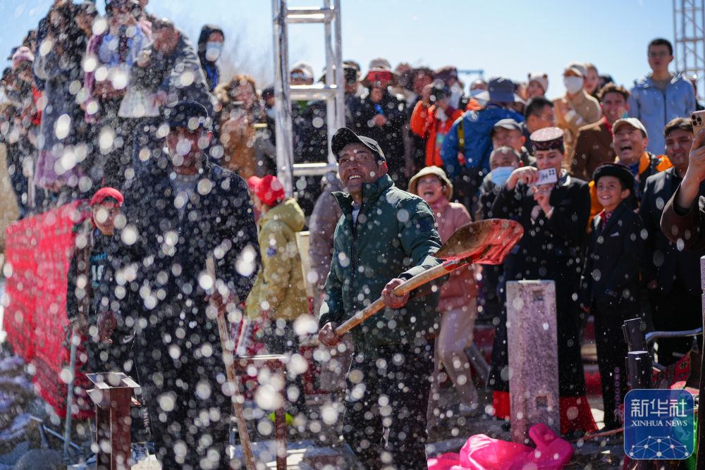 ↑ 3月22日,在新疆塔什库尔干塔吉克自治县“彩云人家”民俗村,当地村民演示“破冰引水”非遗民俗后,将渠水泼向观众,表示祝福。
