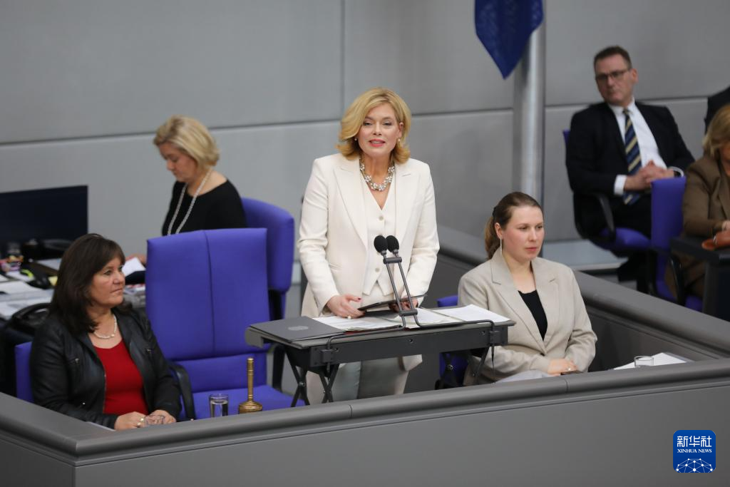 3月25日,在德国柏林,新当选德国联邦议院议长尤利娅・克勒克纳(中)在联邦议院发表讲话。新华社记者 杜哲宇 摄