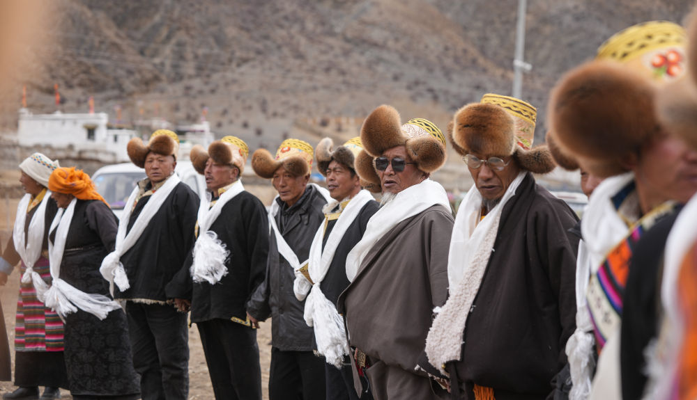 ??旺庆老人(左七)在春耕大典上唱颂词(3月16日摄)。