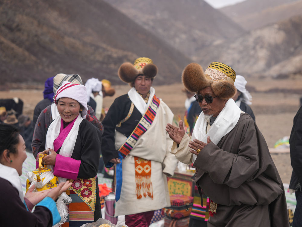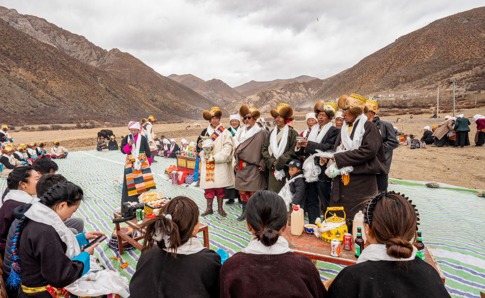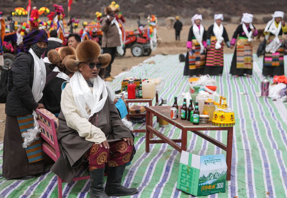 ??旺庆老人(前排带墨镜者)在春耕大典上为客人敬酒献唱(3月16日摄)。