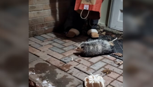 在多次努力下,負鼠終於離開了外賣袋——但它卻並沒有走遠,而是賴在了房屋門口,成功“堵門”,不讓他們回家。