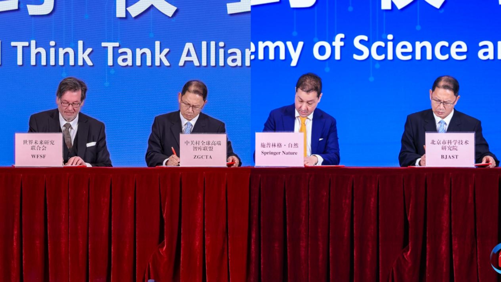 签约环节,举行中关村全球高端智库联盟签约仪式。2024年,来自中国、巴西、印度、意大利、日本、尼泊尔、塞尔维亚和西班牙8个国家的23家高端智库正式成为智库联盟理事单位。在新增智库联盟理事单位签约仪式上,14家理事单位代表出席仪式。未到场的理事单位也通过精心录制的祝福视频,表达了对加入智库联盟的喜悦以及对未来合作的期待。智库联盟现已发展成为16个国家95家联盟理事单位的民间多边交流合作平台,涵盖综合智库、科技智库、经济智库、行业智库、出版传媒智库、企业智库六种类型。智库联盟致力于推动跨国界、跨领域的深度合作,通过资源共享、优势互补和协同创新,与国际组织等机构实现互利共赢。在智库联盟国际与区域合作签约仪式上,智库联盟与世界未来研究联合会签署战略合作协议。同时,智库联盟理事长单位北科院与副理事长单位施普林格・自然就新书出版签署合作意向协议。智库联盟理事长、北科院院长伍建民,埃里克・F・奥弗兰德先生,施普林格・自然大中华区总裁安诺杰(Arnout Jacobs)等代表出席签约仪式。