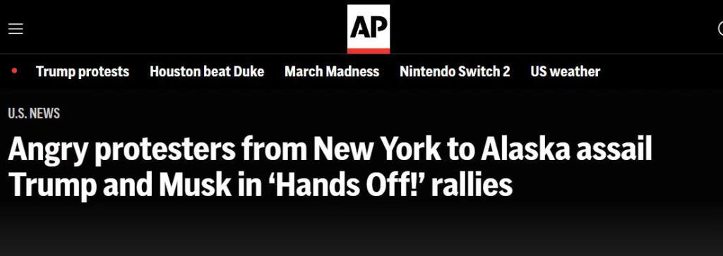 这是5日全美各地抗议示威者的呼声。当天,人们走上街头,有的聚集在当地议会大厦前。他们手举“别碰我们的民主”“别动我们的社保”等标语,表达对特朗普和埃隆・马斯克领导的政府效率部在政府裁员、经济、移民和人权等方面政策的愤怒情绪。