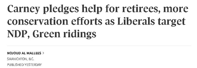自由党党魁马克·卡尼(Mark Carney)周一承诺,将为在市场动荡中遭受损失的退休人士提供支持,同时加大自然保护力度,以争取新民主党(NDP)和绿党选民的选票。