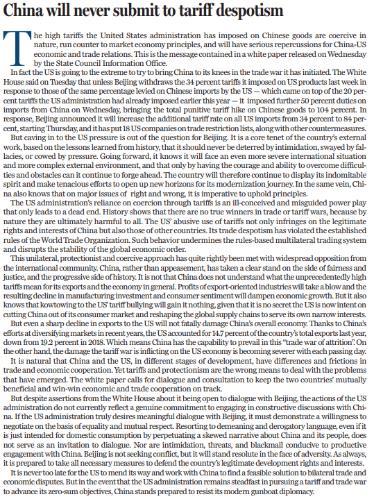 美国政府的关税胁迫是在玩弄强权,方向错误,只会走入死胡同。从历史上看,贸易战、关税战没有赢家,本质上不会对任何一方有利。美国滥用关税,侵犯了中国及其他国家的正当权益,且违反世界贸易组织规则,破坏以规则为基础的多边贸易体制,冲击全球经济秩序稳定。