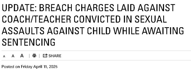 约克区一名被判两项对未满16岁儿童性干扰罪名的教师兼冰球教练,近日涉违反保释令,受到新的指控。