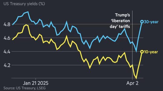 特朗普宣布的“對等關稅”,曾一度推動資金轉往債市,但此後,傳統上被視為避險資產的美國國債卻被投資者大量拋售,導致收益率上升。路透社當地時間4月9日報道稱,美國30年期國債收益率過去三天內飆升近60個基點,一度突破5%大關。報道稱,如果這一趨勢持續,將是自1981年以來最嚴重的一次拋售。