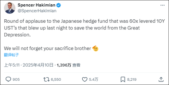 同一天,在社交媒體X平台,相關傳聞也逐漸甚囂塵上。一名資本管理公司高管高調表示,有日本對沖基金在前一晚以60倍杠桿押注10年期美債,它的爆倉卻意外拯救了世界免於進入大蕭條的時代:“兄弟,我們不會忘記你的犧牲”。