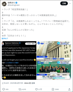 不過,晚些時候,美國媒體人率先曝出——美國的盟友日本拋售了美債。至此,相關傳聞越來越多,有市場人士稱是日本對沖基金所為。日本網友則認為,或許是此前投資失敗的一家日本對沖基金在此輪市場震蕩中恐慌拋售了美債,反而“拯救了世界”,迫使特朗普暫緩征收關稅。