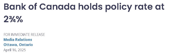 加拿大央行今天宣布维持隔夜目标在2.75%,银行利率为3%,存款利率为2.70%。
