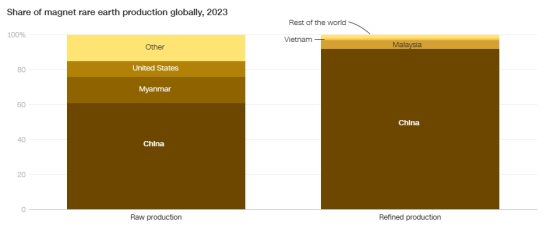2023年,全球超90%的精煉稀土來自中國。 CNN制圖
