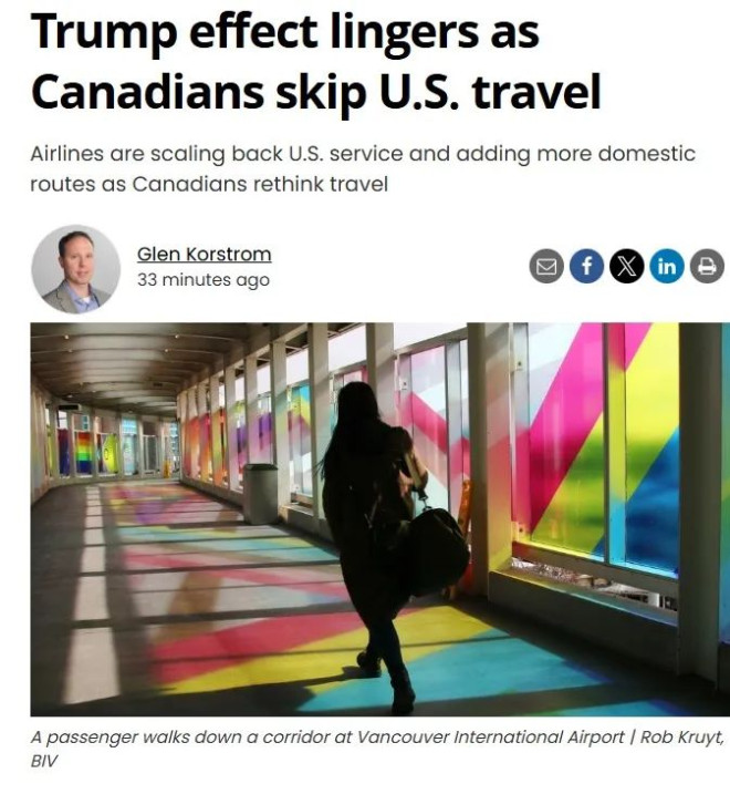 旅游数据机构OAG则表示,4月至7月之间,加拿大前往美国的机票预订量下降了超过70%,显示加拿大人确实在“用脚投票”。