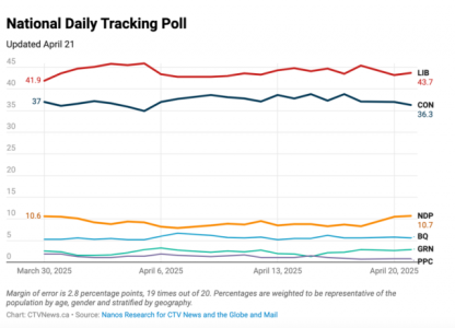 根據Nanos Research於4月17日、19日和20日進行的三日滾動抽樣,自由黨的支持率為44%,保守黨為36%。