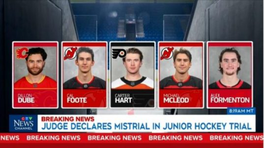 安省法官昨天突然宣布一樁涉及五名職業冰球運動員性侵案的審訊無效,並解散了陪審團。案件將由一個新的14人陪審團審理。