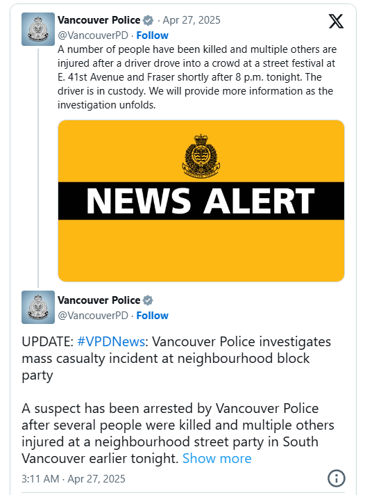 VPD在X平台上发布消息称,“温哥华警察和受害者服务专业人员已经部署,以帮助任何尚未与在Lapu Lapu(节日)上的亲人取得联系的人”。