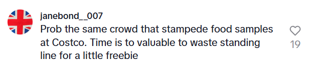 “可能和在Costco抢食品试吃的是一拨人,时间太宝贵了,不值得为了一点小赠品而排队。”