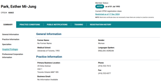 根據CPSO網站信息,朴醫生1993年畢業於多倫多大學,並於2006年開設了自己的診所。Unity Health表示,她在St. Joseph’s Health Centre健康中心執業25年,並於2024年7月停止行醫,12月正式辭職。