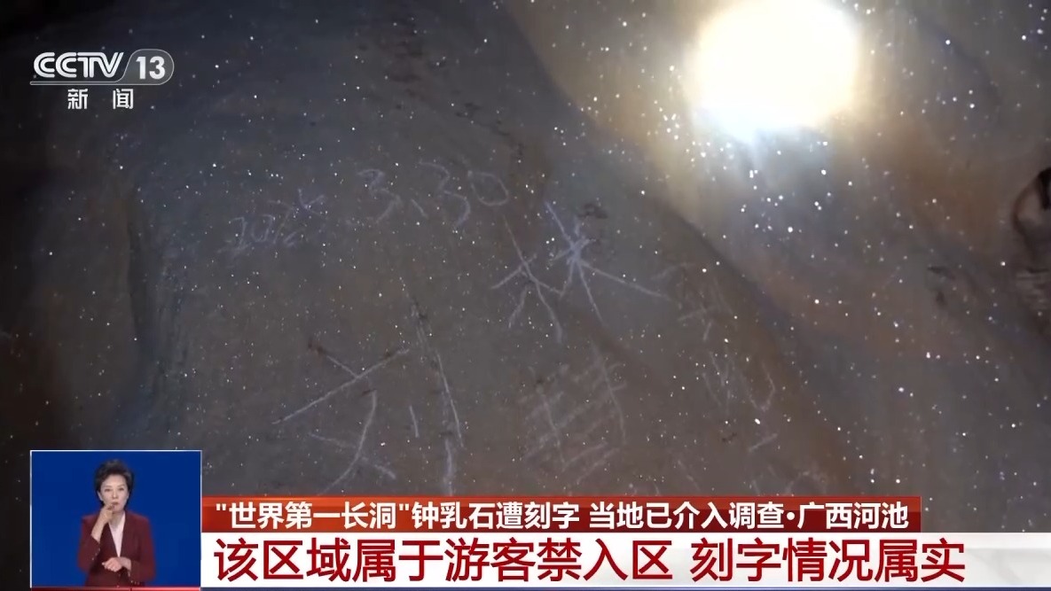 广西江洲地下长廊位于河池市凤山岩溶国家地质公园内,被称为全世界发育于二叠系可溶岩地层中的“第一长洞”。洞内堆积物体量巨大,景观独特,吸引了不少游客探洞旅行。近日,一名网友在社交平台上发帖称,江洲地下长廊的钟乳石上,被人清晰地刻上了“某某某到此一游”等字样,刻字印记共有两处。发帖人表示,看到钟乳石被刻字的一瞬间,十分心痛。