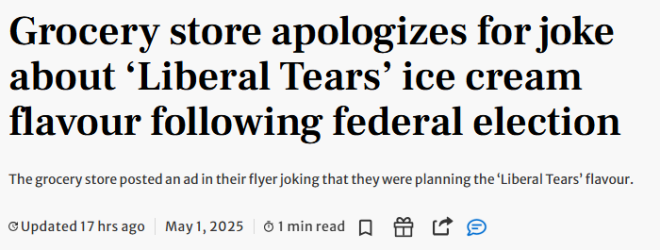 Village Grocer周三在其每周传单中刊登了一则广告:“随着周一晚上选举结果揭晓,Eddie计划在本周推出的‘自由党眼泪’冰淇淋口味不得不取消,我们只好启动B计划。”