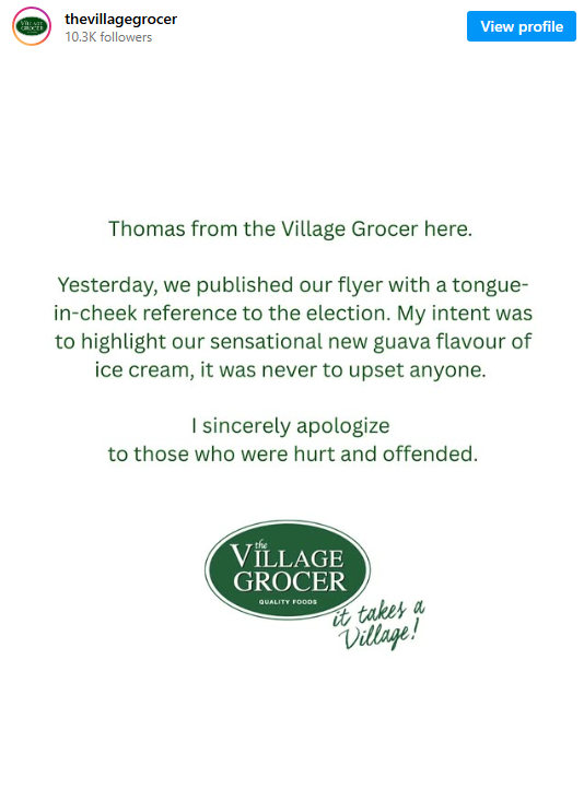该店周四在Instagram上道歉时写道:“我们发布的传单以调侃的方式提到了大选,本意是突出我们新推出的番石榴冰淇淋口味,绝对无意冒犯任何人。”
