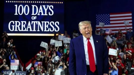 當地時間4月29日,特朗普出席大型集會,慶祝上任100天。路透社