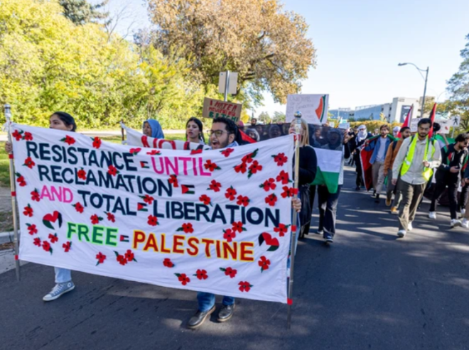 2024年10月8日,在萨斯卡通,萨斯喀彻温大学的学生罢课以支持巴勒斯坦“抵抗运动”。(Michelle Berg/Saskatoon StarPhoenix)