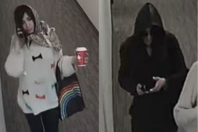 据警方描述,一名嫌疑人是黑发女子,身穿黑色裤子、白色毛衣(上有彩色蝴蝶结),围着围巾,手提彩虹图案的包。