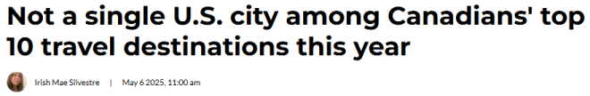 今年,越来越多的加拿大人不想去美国旅行了。美国加州的州长正在试图说服加拿大人去他们那儿玩,说他们有沙滩、葡萄园和户外探险。然而,事实证明,加拿大人更愿意在本国内,或者去更远的国外城市。