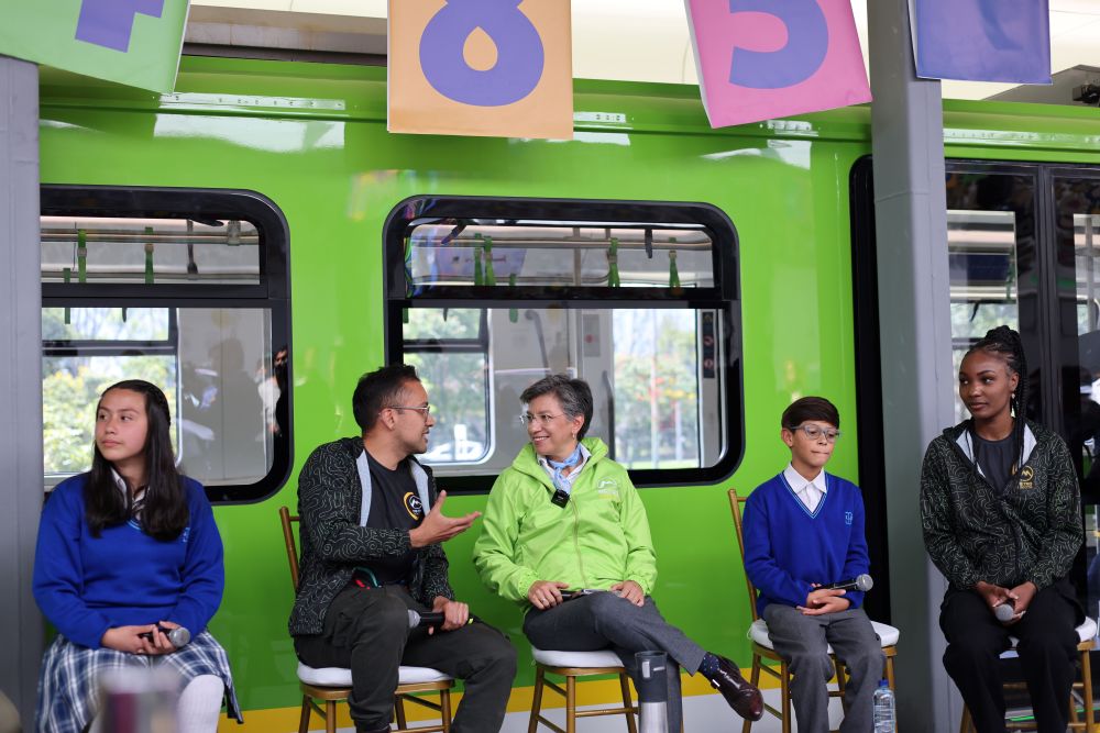 2023年8月10日,哥伦比亚波哥大市长克劳迪娅・洛佩斯(中)在波哥大地铁的模型车厢旁跟参加活动的师生交流。按照计划,由中企承建和运营的波哥大地铁一号线将在2028年正式投入运营。新华社记者 周盛平 摄