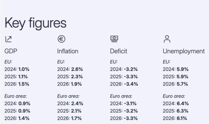 报告预测,今年欧元区经济仅增长0.9%,欧盟经济仅增长1.1%。与去年11月份发布的秋季经济展望相比,经济增长预期大幅下调。而去年则预测今年欧元区经济增长1.3%,欧盟经济增长1.5%。