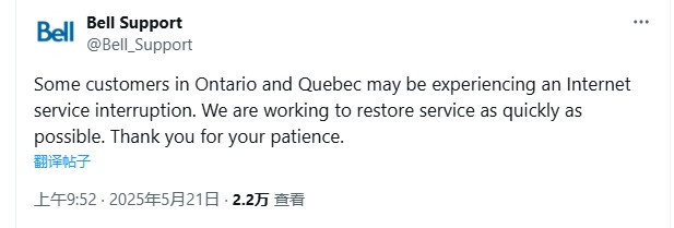 约10点前,Bell客服号在Twitter上证实了这次事件,并表示“安大略省和魁北克省的部分客户可能正在经历网络服务中断。我们正在尽快恢复服务。感谢您的耐心等待。”