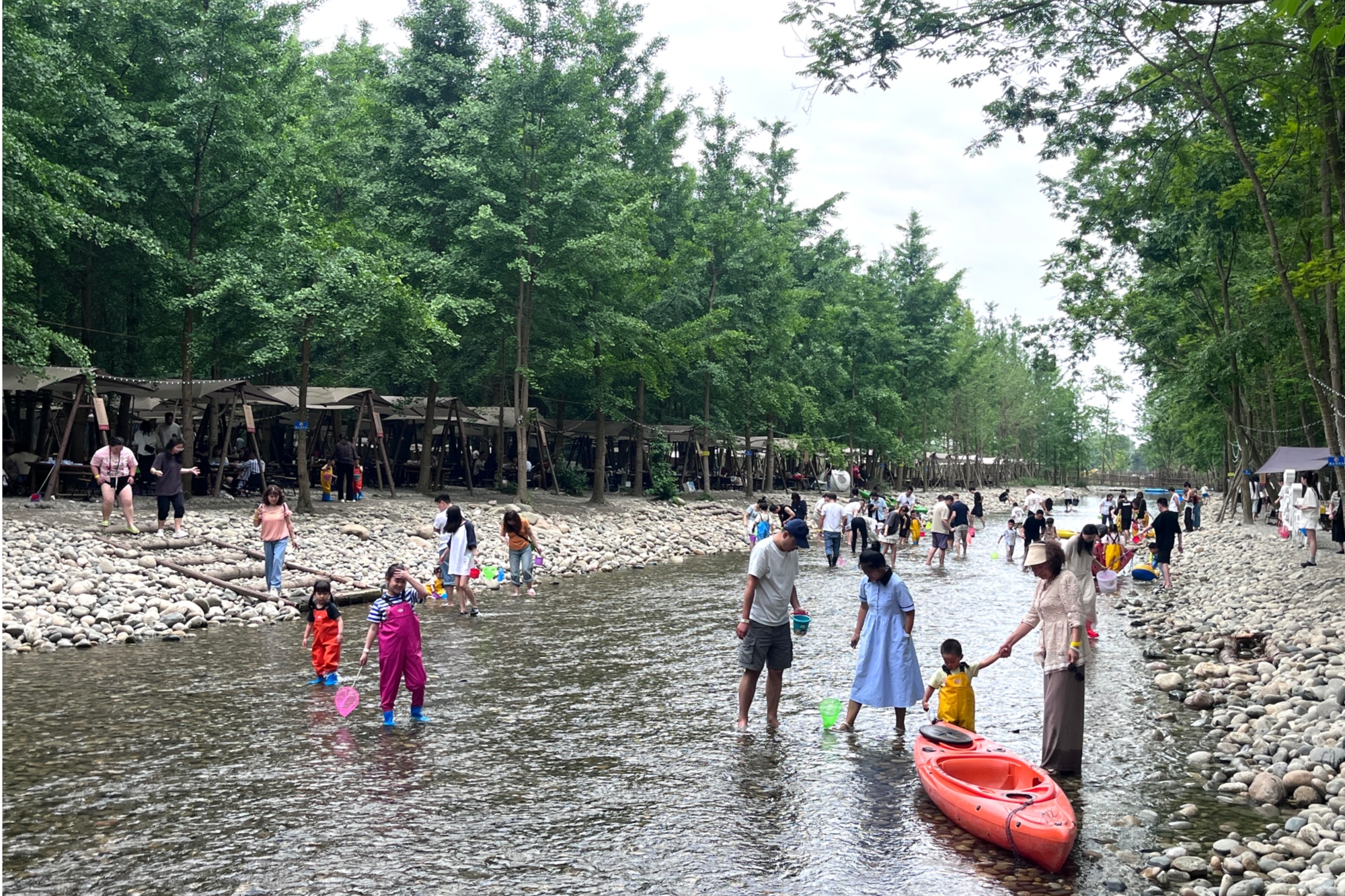 下午1点钟,工作人员向小河里投放了螃蟹、乌龟等,吸引众游客纷纷踏入水中,满心欢喜地带着小朋友们一起感受紧张刺激的“捉捕野趣”。