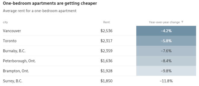 一居室公寓在租赁市场上的售价也在下降——根据租赁单元挂牌网站Rentals.ca的数据,多伦多一居室公寓的平均租金同比下降了5.8%,而加拿大其他一些城市的降幅甚至更大。