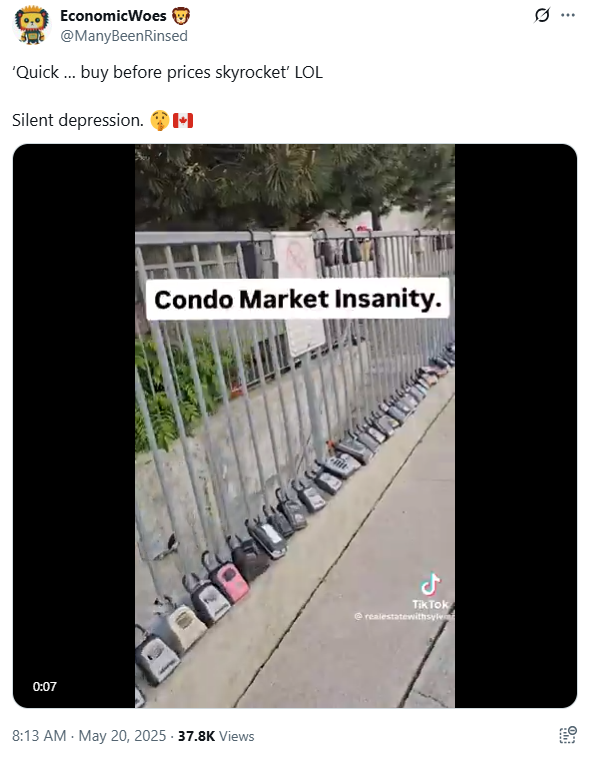 这位网友说:“‘快啊!房价暴涨之前赶紧上车!’啊哈哈,沉默的大萧条。”视频画面上写着“Condo市场太疯狂了!”↓↓↓