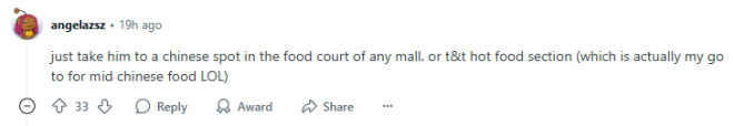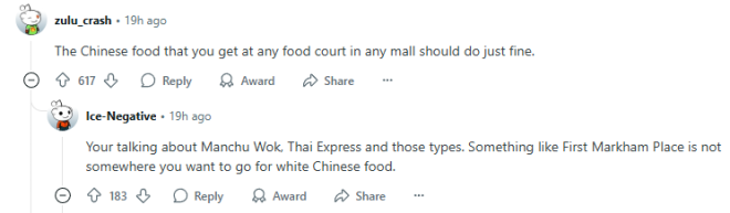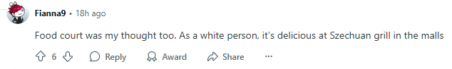 另一条高赞回复写道:“任何商场里的广场(food court)中餐,应该就挺好的。”