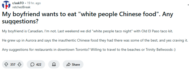 在这条帖子里,这位网友描述道:“我的男朋友是加拿大人。我不是。上周末,我们用Old El Paso的玉米卷饼套餐搞了个‘白人taco之夜’。他在Aurora长大,并表示那里的不正宗中餐超好吃,并且现在很想吃。多伦多市中心有这样的餐馆推荐吗?”